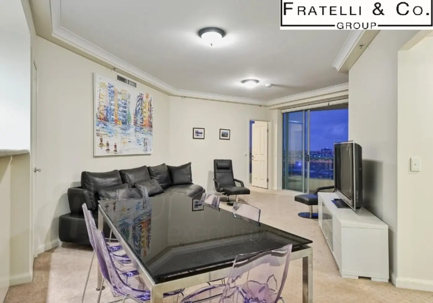 Walk into an open plan living and dining area connected directly to the balcony.